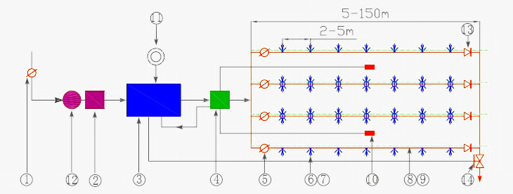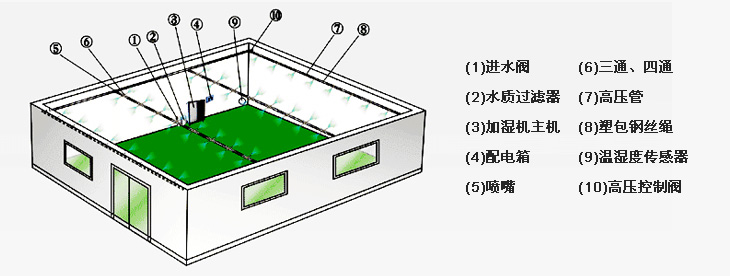 (1)進水閥 (2)水質過濾器 (3)加濕機主機 (4)電腦多路濕控器 (5)高壓控製閥(電動或手動) (6)噴嘴 (7)高壓三通、四通 (8)高壓管 (9)塑包鋼絲(si) 繩 (10)溫濕度傳(chuan) 感器 (11)冷水機組(選配) (12)離子軟水機 (13)高壓單向閥 (14)高壓電動閥排汙係統
