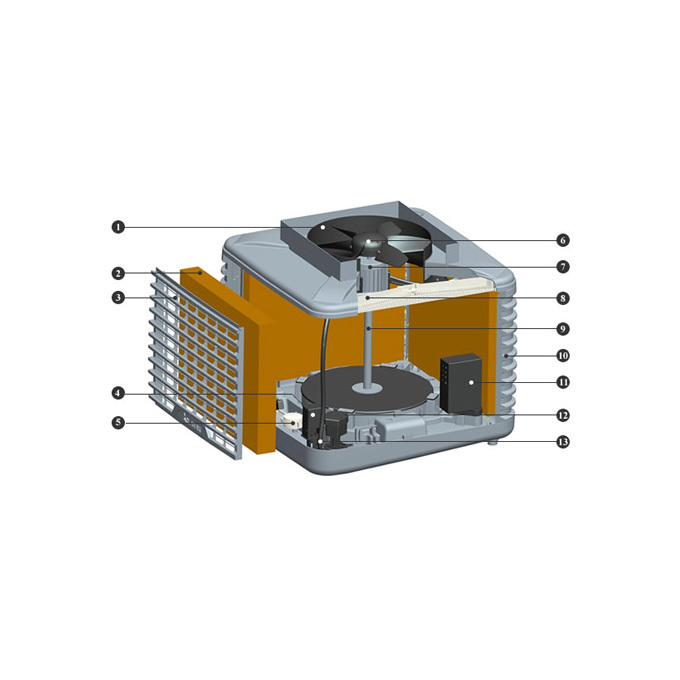 2、外框為工程塑料壓製而成,抗老化5090/6090濕簾紙,濕簾紙采用進口樂泰膠水,耐水浸泡,不易脫膠塌陷腐爛,使用壽命長,8年以上。3C認證鋁殼銅芯電機,高強度大三葉扇葉,風量大,噪音小,方形工程塑料風管